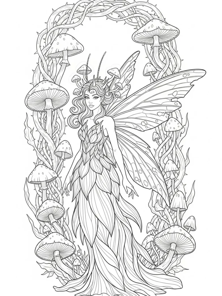 This coloring page features a graceful fairy standing at the center of a vine wrapped archway filled with tall mushrooms and twisting stems. Her wings stretch wide with delicate patterns, while her flowing dress is made of layered leaf like shapes that create beautiful movement. Fine line work fills the mushrooms, vines, and fairy details, giving the design a rich fantasy feel without becoming too heavy. The circular frame keeps the composition balanced and draws your eye gently around the entire scene.