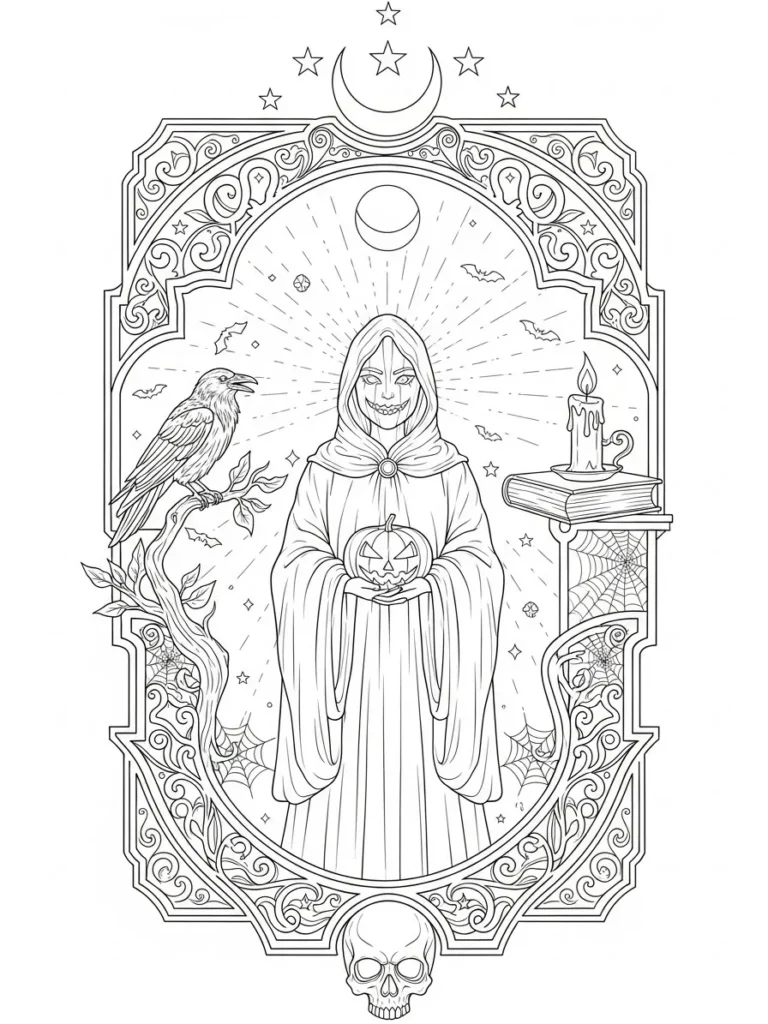 This coloring page shows a calm yet eerie witch standing at the center of an ornate frame filled with flowing scrollwork and delicate details. The figure wears a long hooded robe with soft folds that create plenty of space for shading, while she holds a carved pumpkin that adds a subtle Halloween touch. Around her, you will notice crescent moons, stars, bats, and glowing lines radiating outward, all framed by intricate borders. A raven perches on twisted branches to one side, while candles, books, spiderwebs, and a small skull complete the scene with a magical gothic vibe. The line work is fine and clean, making the entire layout feel detailed without being cluttered.