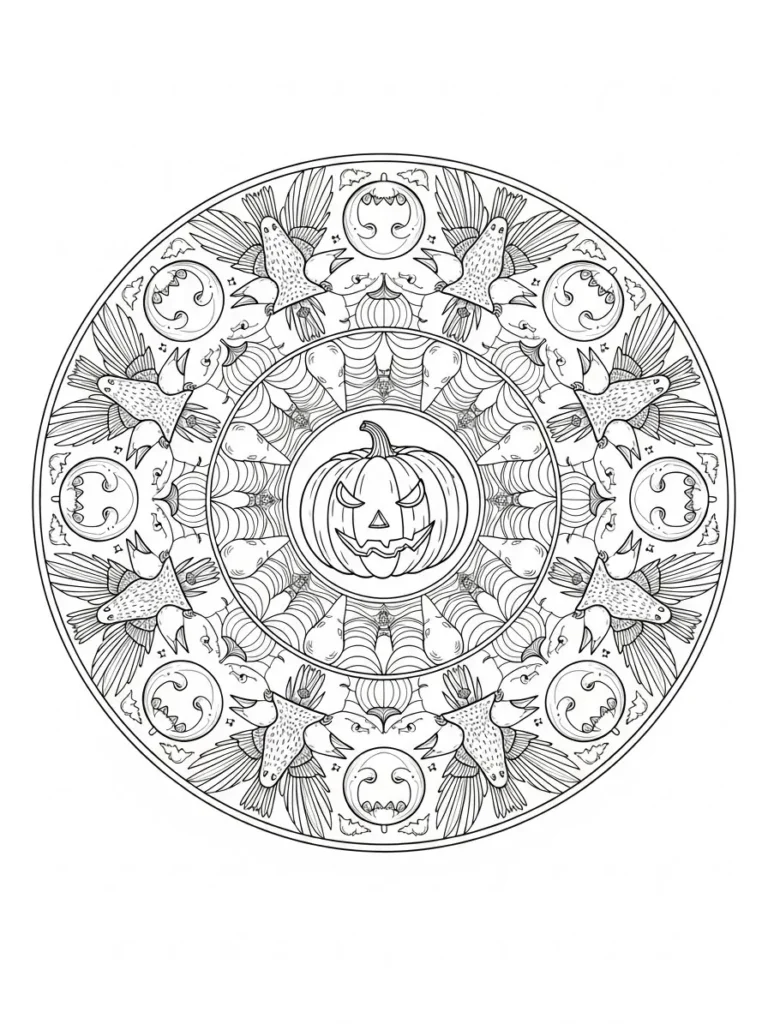 This coloring page features a detailed circular mandala centered around a mischievous jack o lantern face. Radiating outward are repeating patterns of bats, crescent moons, feathers, and winged shapes arranged in perfect symmetry. Fine clean lines create lots of small sections that feel intricate but not overwhelming, while the round layout keeps everything balanced and soothing to look at. The mix of spooky icons and flowing shapes gives the design a playful yet mysterious Halloween energy.