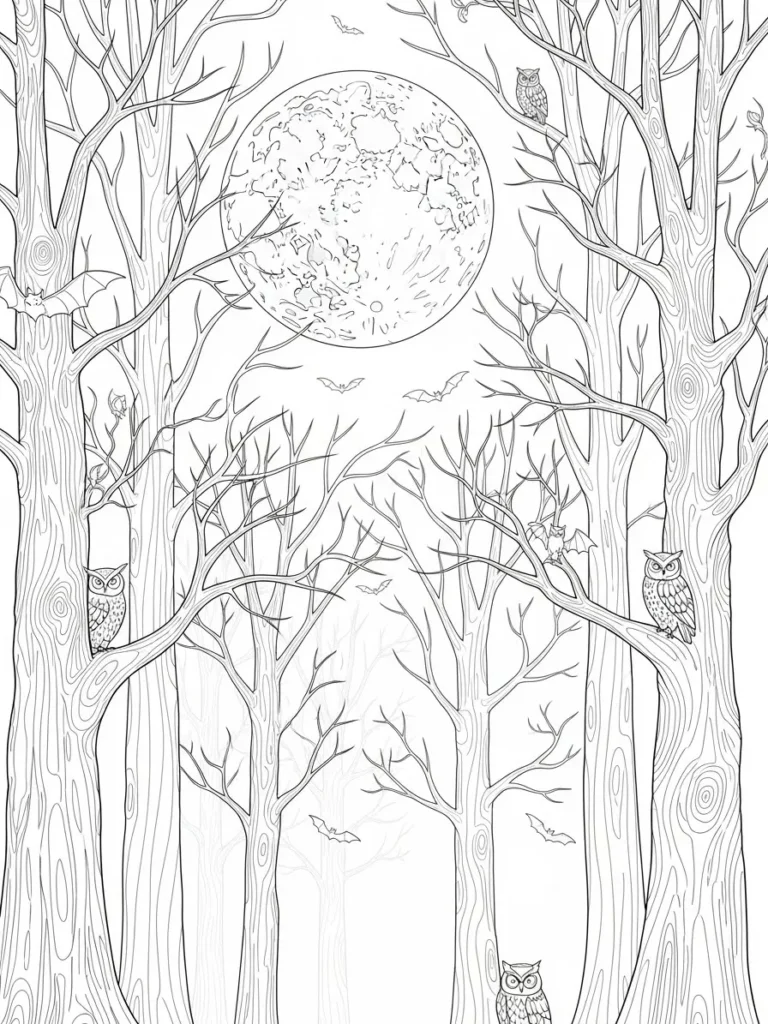 If you’re into peaceful spooky scenes, this one feels incredibly soothing to color. I love taking my time shading the trees in soft earthy tones and then letting the moon glow with lighter colors. Coloring the owls feels comforting and almost meditative, like spending a quiet night in the woods without a single sound around. This page always helps me slow down and settle into a calm creative rhythm.