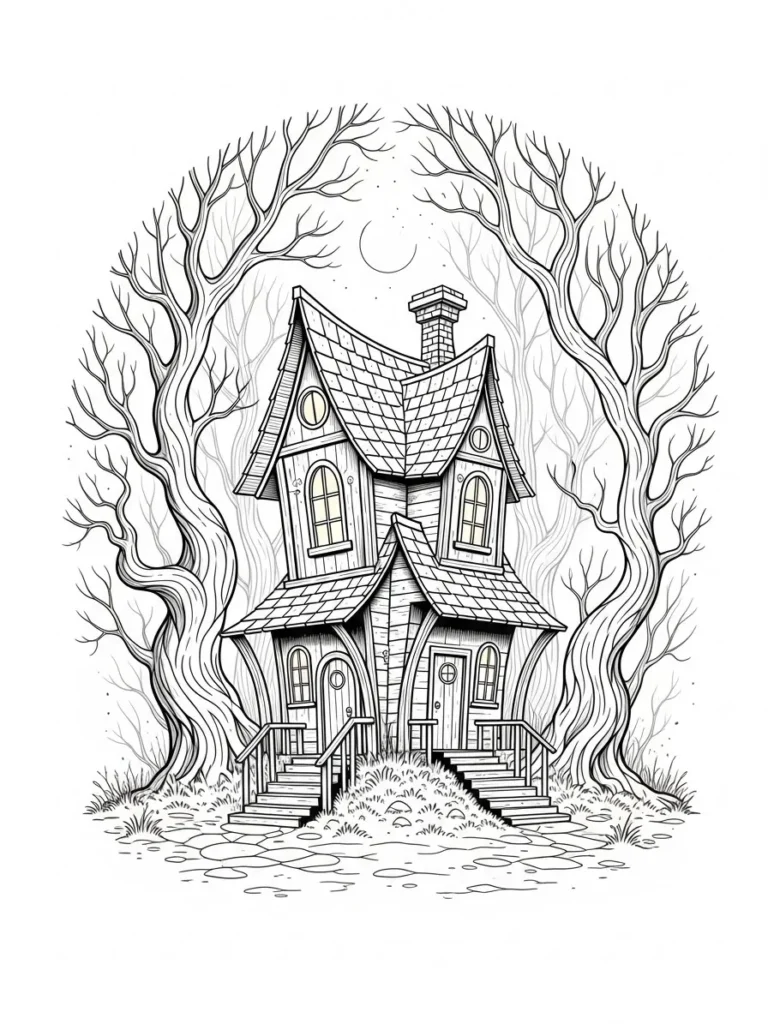 This coloring page features a slightly crooked cottage nestled between two tall, winding trees that curve inward like a natural frame. The house has layered rooftops, narrow windows, and small staircases leading to twin doors, all drawn with fine, consistent line work that feels detailed but still easy to follow. The bare branches stretch overhead toward a crescent moon, creating a quiet spooky atmosphere without feeling dark or heavy. Soft textures in the shingles, wood panels, and tree bark add depth, while the circular layout keeps everything balanced and soothing to look at.