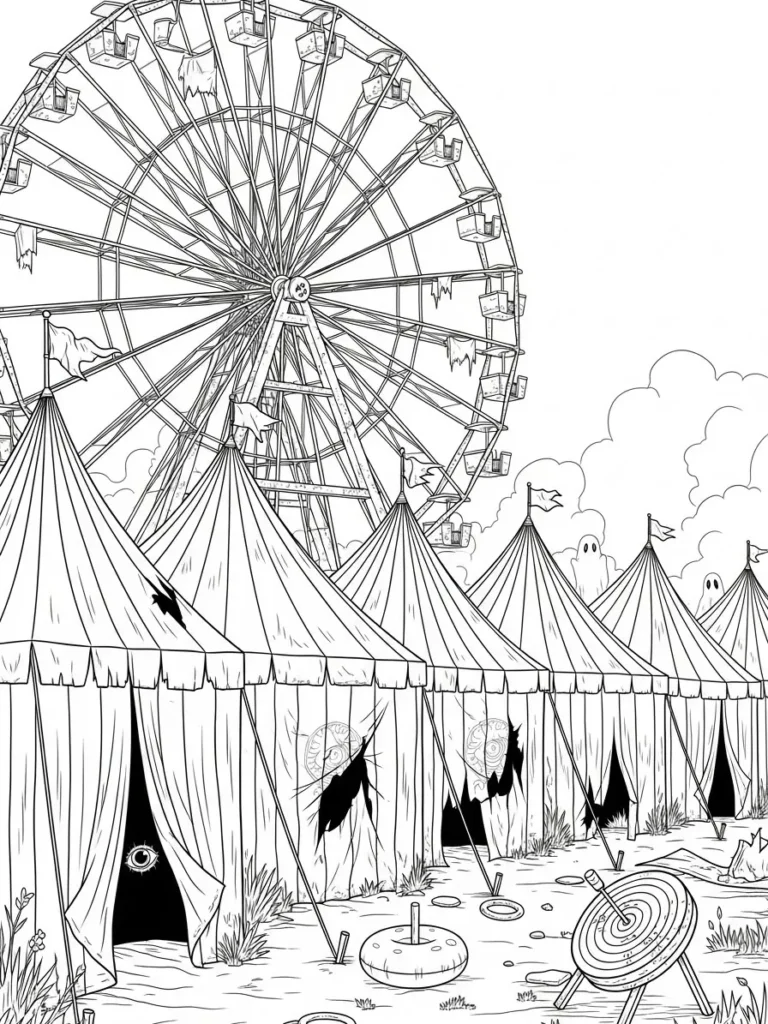 This coloring page captures a spooky carnival scene with a towering ferris wheel rising behind a row of tattered circus tents. The tents line the foreground with torn fabric openings, peeking eyes, and subtle eerie shapes hidden in the shadows. Fine detailed line work fills the ferris wheel with spokes and hanging carts, while soft clouds and small ghostly figures float in the background. The ground is scattered with odd carnival objects like targets and abandoned props, creating a scene that feels unsettling but playful at the same time. The overall layout feels busy in a good way, with lots of small sections that invite slow and careful coloring.