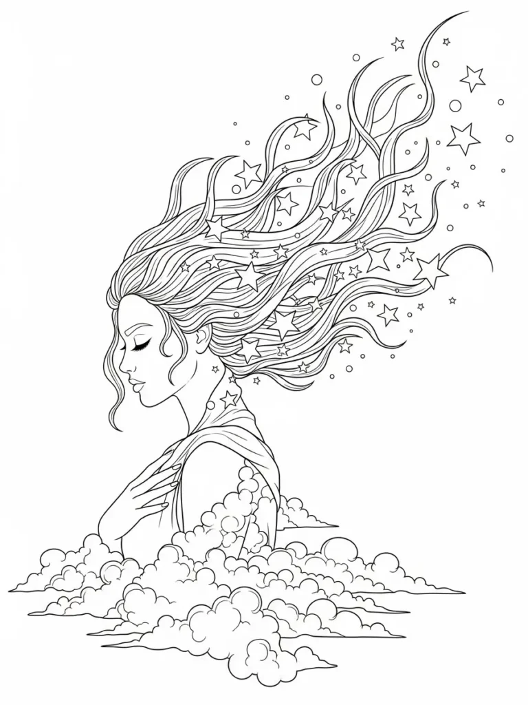 This coloring page features a serene feminine figure emerging from soft clouds, with long flowing hair that transforms into swirling strands of stars and tiny orbs. The profile pose feels calm and mysterious, while the fine line work in the hair creates movement and rhythm across the page. Delicate stars are scattered throughout the flowing lines, giving the whole design a dreamy otherworldly feel. The clouds at the bottom are drawn with gentle rounded shapes that balance the detailed hair above, creating a layout that feels airy and elegant at the same time.
