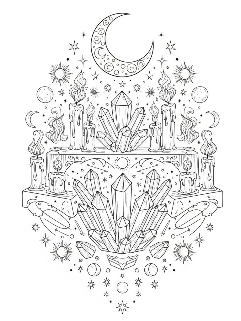 This coloring page features a beautifully layered crystal altar surrounded by dripping candles, swirling smoke, and celestial symbols. Tall faceted crystals rise from stacked platforms, each drawn with clean angular lines that contrast nicely with the soft curves of flames, stars, and moons floating around them. A large crescent moon crowns the scene, while smaller planets and sparkles fill the background with a magical rhythm. The layout feels balanced and symmetrical, with plenty of detail to enjoy without the page feeling crowded.