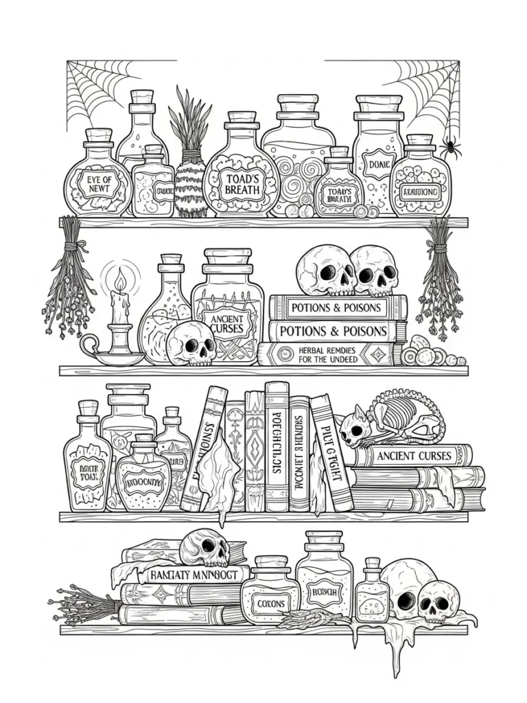This coloring page is packed with charming spooky details across stacked wooden shelves filled with potion bottles, old books, skulls, herbs, candles, and cobwebs. Each shelf has its own little story, with jars labeled in playful spooky ways, dripping wax, tied bundles of plants, and mysterious glass shapes drawn in clean fine lines. The layout feels full but organized, with repeating bottle shapes and book spines creating a cozy rhythm that is easy on the eyes. The line work is crisp and detailed, making it perfect for slow coloring and experimenting with texture.
