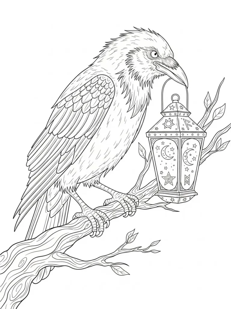This coloring page features a detailed raven perched on a twisting tree branch, holding a hanging lantern decorated with moons and stars. The feathers are drawn with fine layered lines that give the bird a strong, textured look without feeling too dense. The lantern adds a magical touch with its delicate patterns, while the bare branch and small leaves keep the scene grounded and slightly eerie. The open background leaves plenty of breathing room, making the design feel balanced and calm rather than overwhelming.