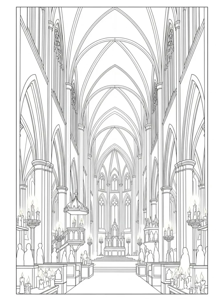 This coloring page showcases a grand gothic cathedral interior with soaring arches, tall columns, and layered vaulted ceilings that stretch upward in perfect symmetry. Rows of candles line the aisle and balconies, adding soft atmospheric detail throughout the scene. The line work is clean and precise, with repeating arches, panels, and architectural accents that create a strong sense of depth. The layout draws your eye straight down the center toward the altar, making the whole design feel dramatic, elegant, and quietly haunting.