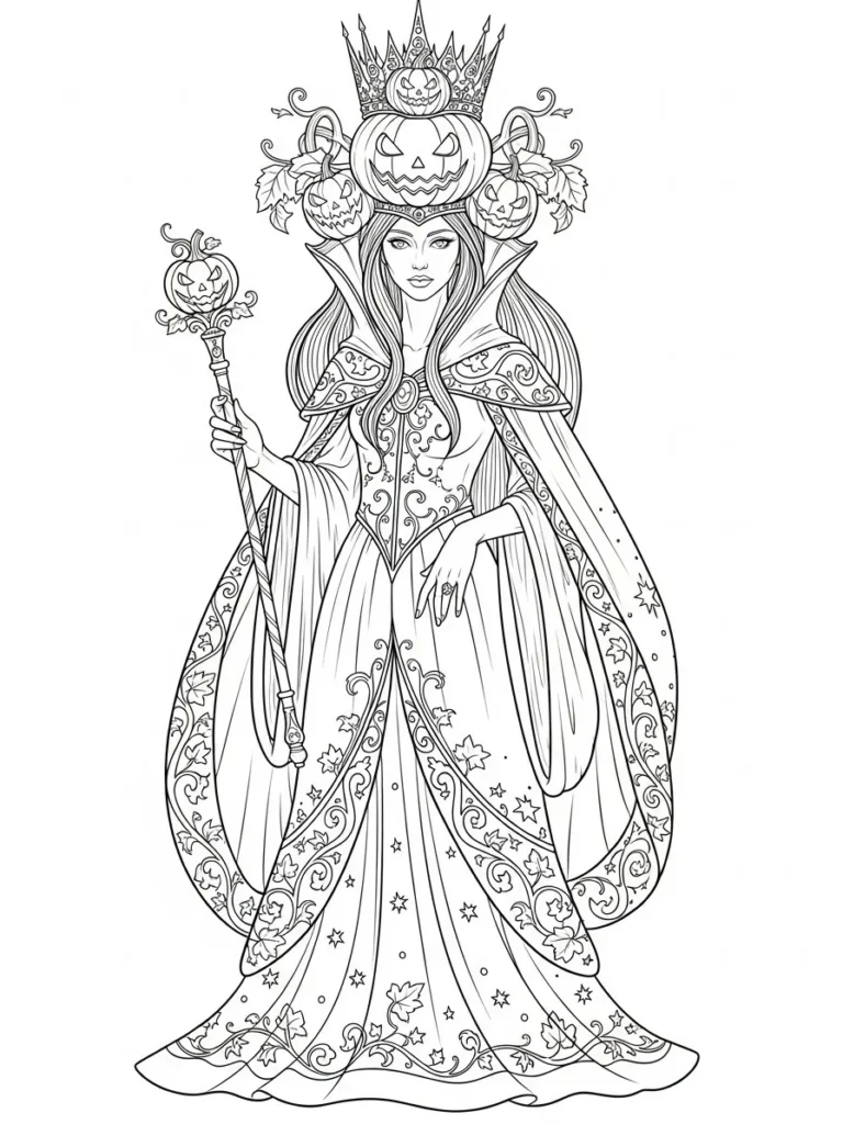 This coloring page features a regal feminine figure dressed in an elegant flowing gown, crowned with a dramatic pumpkin headdress adorned with curling vines and leaves. The crown rises high with intricate details, while smaller jack o lanterns frame her face and add a playful spooky charm. Fine line work fills the gown with swirling patterns, tiny stars, and leaf motifs that flow beautifully from top to hem. The staff she holds echoes the pumpkin theme and balances the composition, giving the entire design a strong, graceful presence that feels magical and slightly eerie.