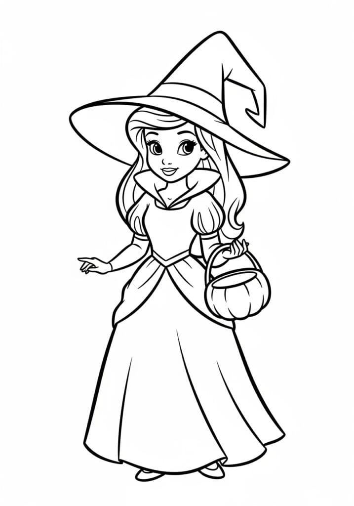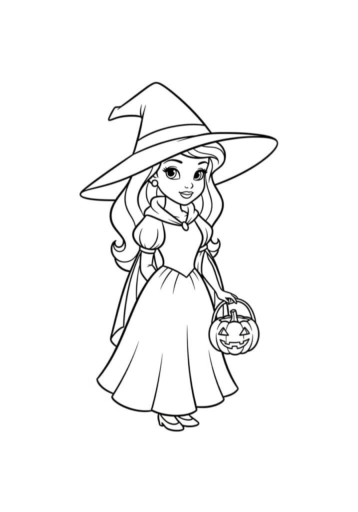 This coloring page features an adorable Disney-style princess dressed up in a full Halloween witch costume, complete with a wide-brimmed pointed hat, a flowing dress with a little cape, and the cutest jack-o-lantern treat basket hanging from her hand. The lines are clean and confident, with a nice medium thickness that makes the design feel polished and easy to work with. The overall layout is beautifully centered with lots of open space in the dress and hat, giving you plenty of room to play with color. Her long wavy hair and delicate facial features add just the right amount of detail to keep things interesting without feeling overwhelming.