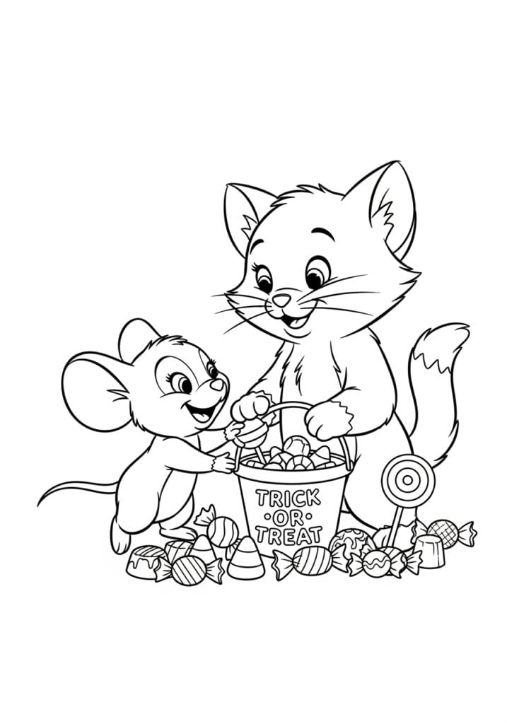 • Cat and Mouse Sharing a Halloween Trick or Treat Bucket Coloring Page