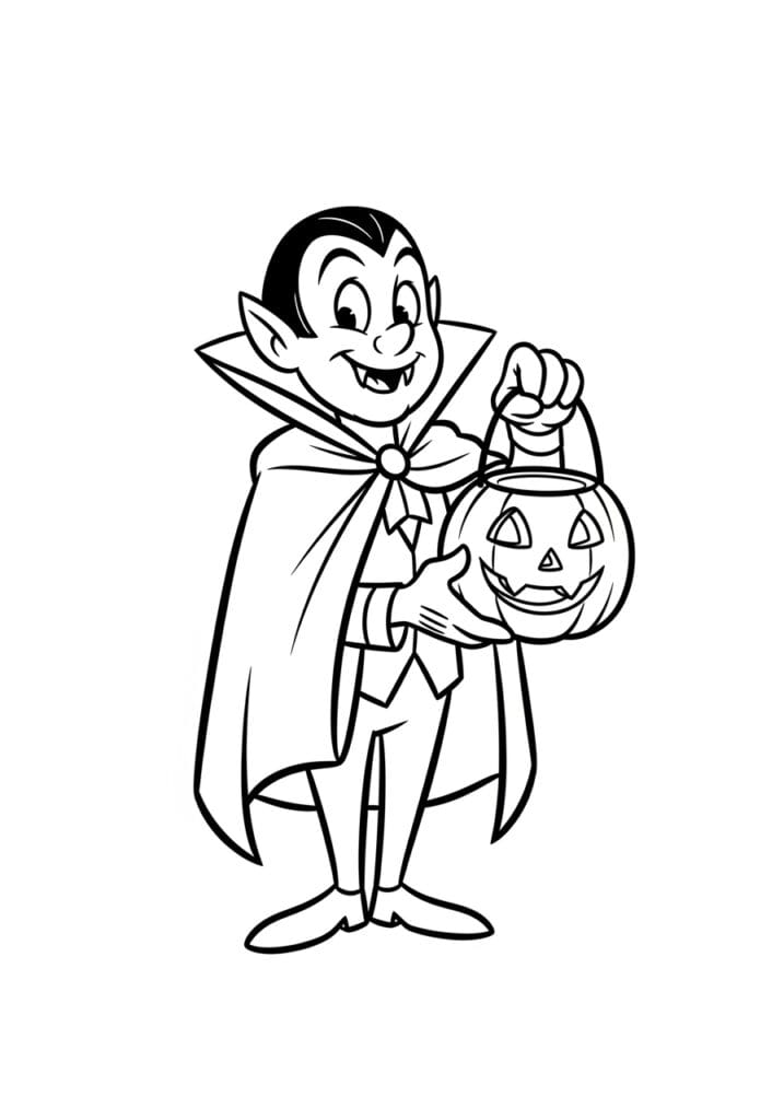 • Friendly Dracula Holding a Jack-O-Lantern Trick or Treat Pail Coloring Page