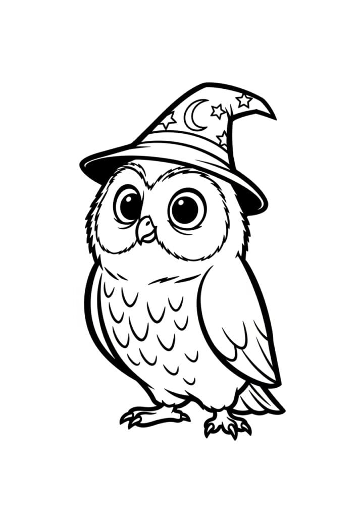 • Magical Owl Wearing a Stars and Moon Witch Hat Coloring Page