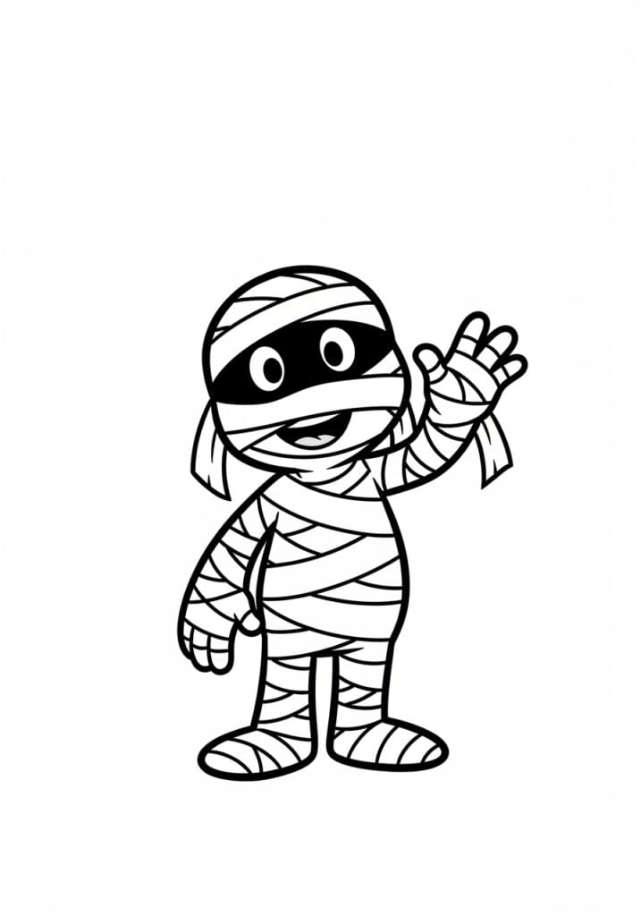 This page features the most lovable little mummy character wrapped head to toe in bandages and waving cheerfully like he is the friendliest creature to ever come out of an ancient tomb. The entire body is covered in overlapping diagonal bandage wraps drawn with clean thin lines that create a really satisfying criss-cross pattern all the way from his round head down to his chunky little feet. His face peeks out through the wrappings with big round cartoon eyes set against a dark shadowed area, giving him a really fun and expressive look without being the least bit scary. The line weight is bold on the outer edges and lighter for the individual bandage lines inside, which gives the whole design a great sense of dimension and makes him feel wonderfully rounded and three-dimensional on the page.