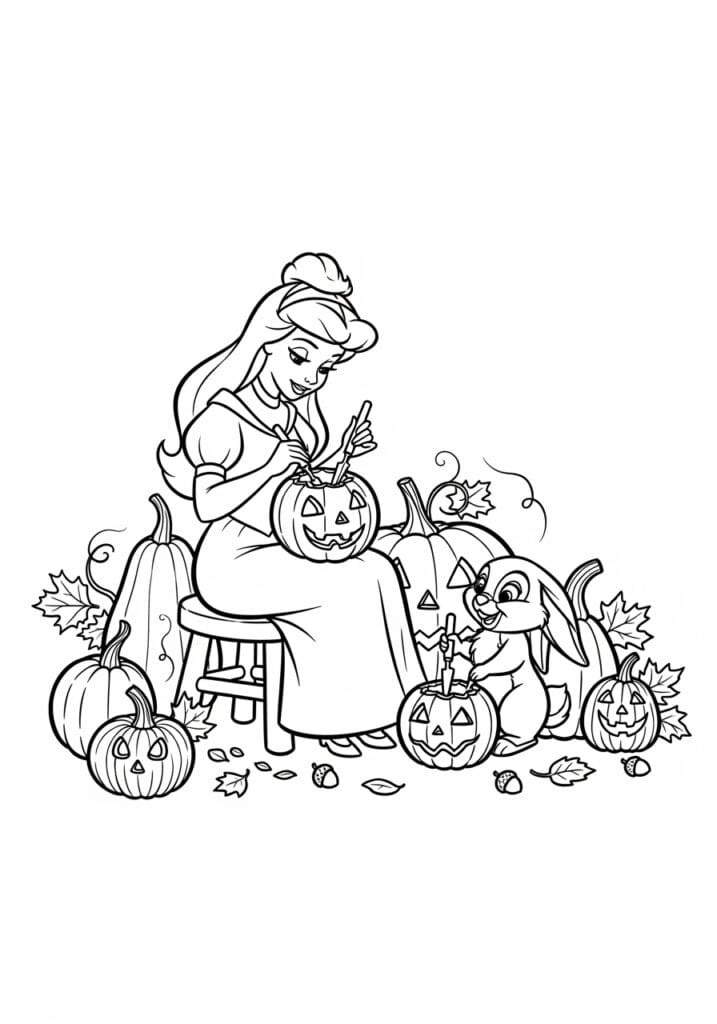 Disney Princess Carving Pumpkins With Her Forest Animal Friend Coloring Page