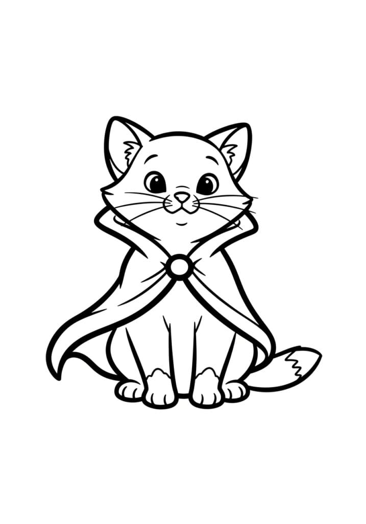 I am completely charmed by this page because it strikes that perfect balance between simple and elegant that makes for such a deeply relaxing coloring experience. The large open cape is genuinely one of my favorite things to color in this whole collection because you can take it in so many different directions, from a classic dramatic black to a rich midnight purple or even a deep forest green for something a little more unexpected. I love the idea of making the brooch a warm metallic gold to add a little glamour, and the cat itself looks absolutely stunning in classic tawny orange, soft grey, or even a creamy white. This little cat is giving main character energy and honestly I respect it enormously.