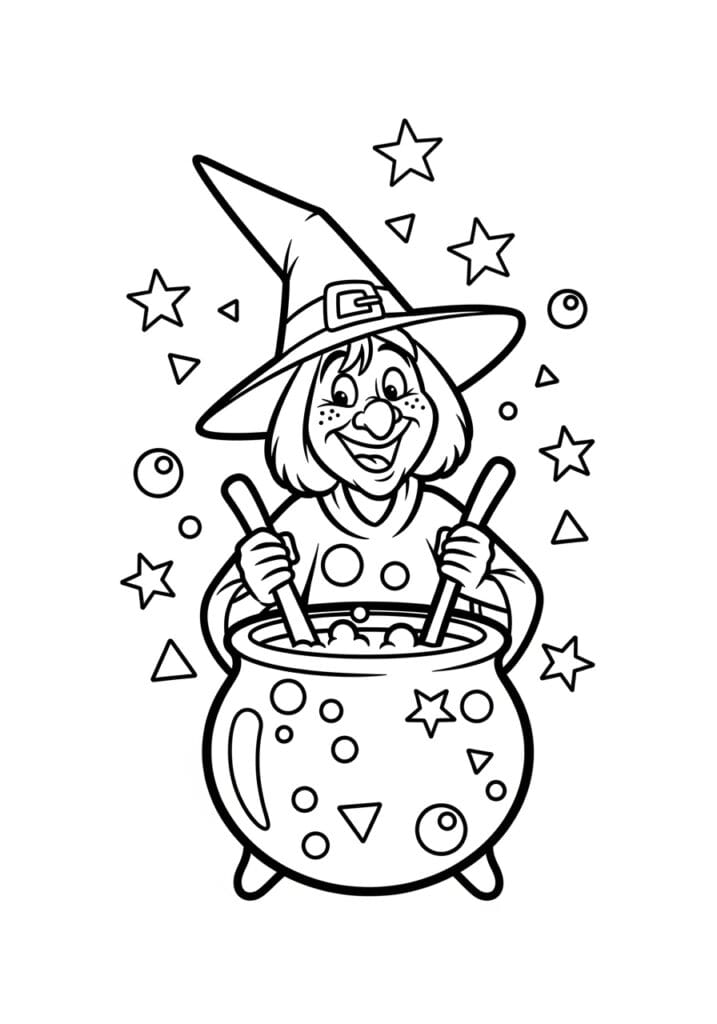 • Jolly Witch Stirring a Magic Potion Cauldron Coloring Page