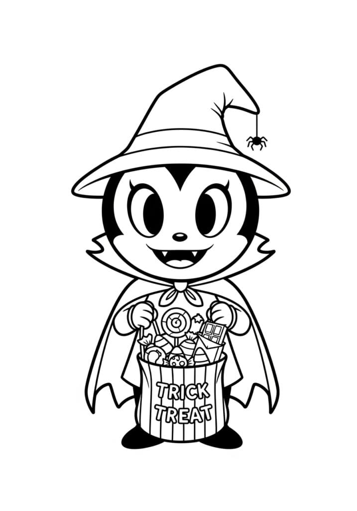 I absolutely love this page because the candy bucket alone keeps things exciting from start to finish. There are so many tiny details to color in there, from swirly lollipops to little wrapped chocolates, and I find that kind of focused detail work genuinely relaxing. The cape is also a dream to color because you can go classic black or get totally creative with deep purples and midnight blues for a more magical feel. That little spider on the hat is my personal favorite detail and I think it deserves its own moment with a pop of bright color. This one is just too cute not to print out immediately.