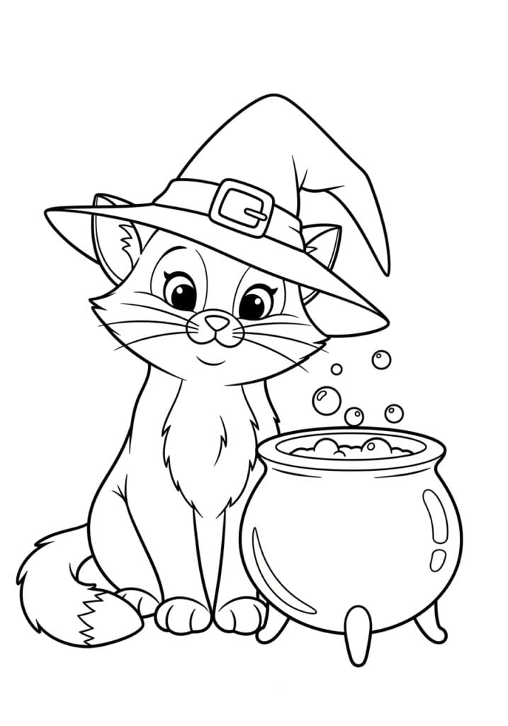 • Witch Cat With a Bubbling Cauldron Halloween Coloring Page
