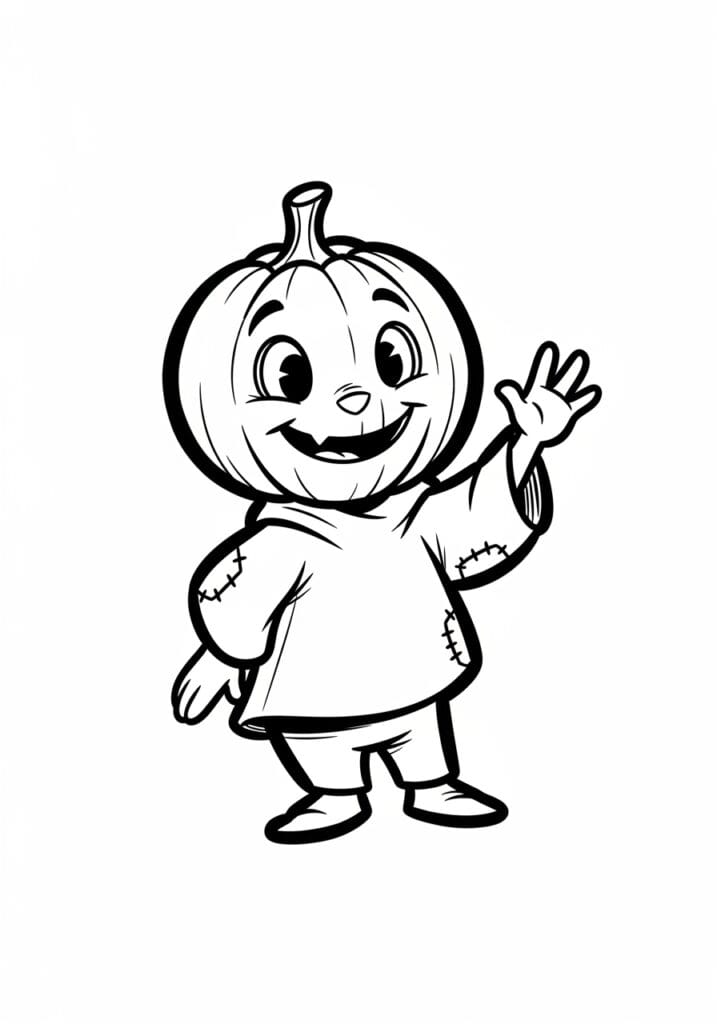 This page features the most cheerful little character with a big round pumpkin for a head, dressed up in a loose scarecrow-style outfit and waving at you like you are old friends. The pumpkin head is drawn with bold thick outlines and lovely vertical ribbing lines that give it a really realistic and satisfying pumpkin texture, while the face has cute expressive cartoon eyes and a big friendly grin that is just impossible not to love. The outfit has adorable little stitch details along the sleeves that add a fun Frankenstein-inspired touch without making the design feel too spooky. The overall line weight is a nice mix of thick confident outlines on the main shapes and thinner detail lines inside, which creates a really appealing contrast across the whole page.