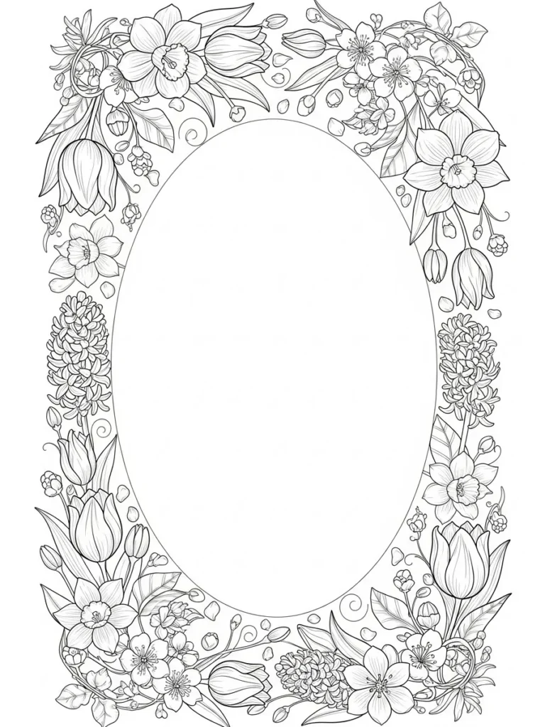 This coloring page features an elegant oval frame wrapped in lush spring florals, with daffodils, tulips, hyacinths, and delicate blossoms weaving together in a balanced wreath layout. The line work is clean and refined, with fine details in the petals and leaves that give the design a soft botanical feel without looking cluttered. The open oval center creates a calm focal point, while the flowers flow naturally around the edges, making the whole page feel light, airy, and perfectly seasonal.