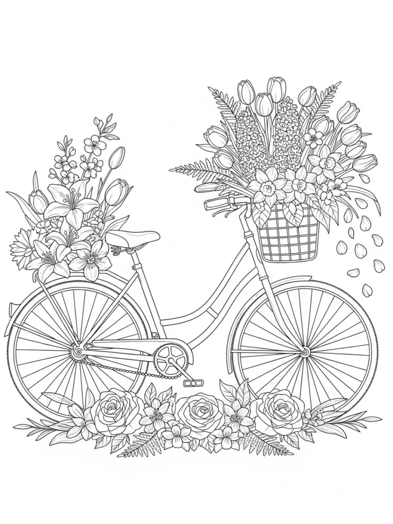 This coloring page features a charming vintage style bicycle decorated with overflowing spring flowers in the front basket and along the back rack. Tulips, roses, daffodils, and leafy accents are drawn with fine clean lines that give the design plenty of detail without feeling too heavy. The wheels and frame add soft structure to the composition, while falling petals and ground florals create a balanced and playful layout that feels fresh and romantic.