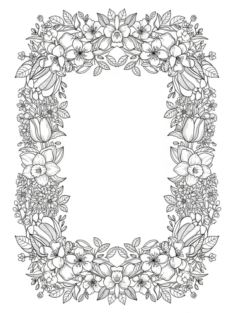 This coloring page features a beautifully detailed floral frame made from layered spring flowers, leafy branches, and delicate buds arranged in a soft rectangular shape. Tulips, daffodils, and small blossoms intertwine along the border, leaving a clean open space in the center that keeps the design feeling light and balanced. The line work is fine and consistent, with lots of petal detail that adds richness without making the page feel crowded.