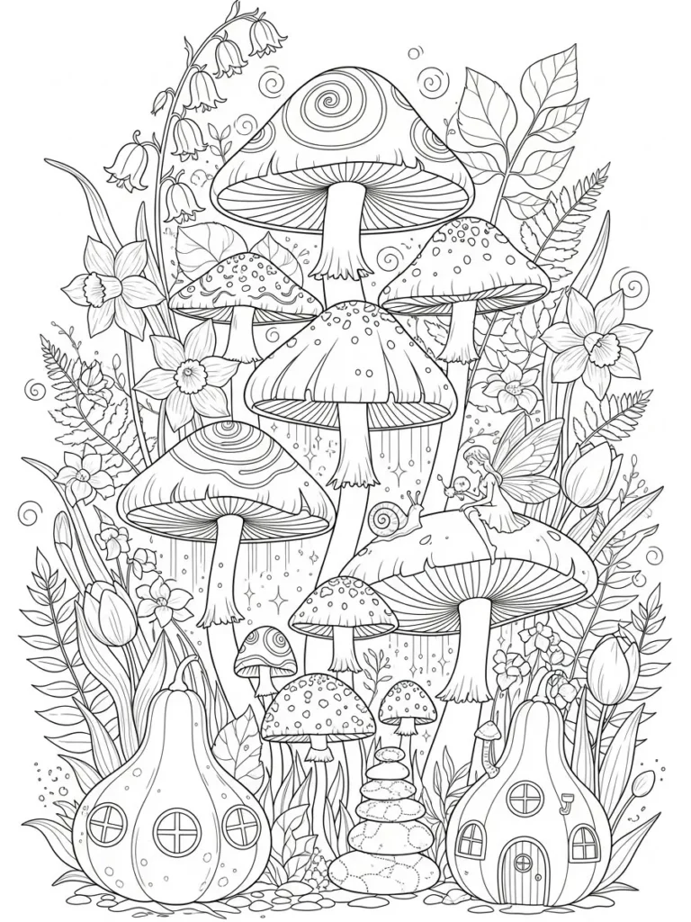This coloring page shows a magical spring scene filled with tall mushrooms, tiny fairy houses, blooming flowers, and curling leaves layered into a vertical woodland garden. The mushrooms feature playful patterns like dots and spirals, while the surrounding florals and ferns add soft movement around the scene. Fine clean lines give plenty of detail without feeling heavy, and the layout feels full yet balanced with little surprises tucked into every corner.