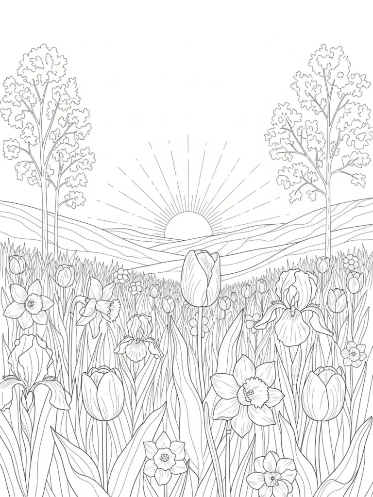 This coloring page shows a calm spring meadow filled with tulips, daffodils, and soft grasses stretching toward a gentle sunrise on the horizon. Rolling hills and simple radiating sun lines create a peaceful backdrop, while tall trees frame the scene on both sides for a balanced and open layout. The line work is light and clean, with flowing stems and softly shaped petals that keep the design detailed without feeling heavy or crowded.
