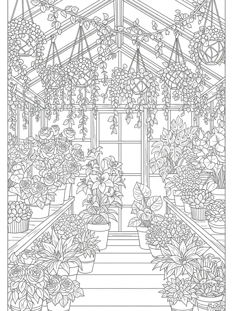 This coloring page shows a charming greenhouse packed with hanging baskets, potted plants, and leafy vines climbing along the beams. Rows of planters line the walkway, filled with blooming flowers and textured foliage, while the glass walls and roof add clean structure to the scene. The line work is detailed but tidy, with fine outlines on leaves and petals that create depth without making the page feel too busy.