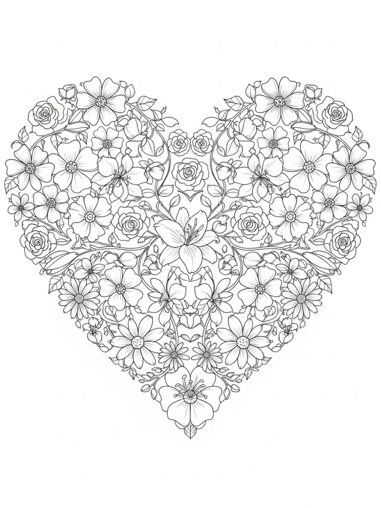 This coloring page features a beautifully symmetrical heart shape formed entirely from spring flowers, leaves, and delicate vines. Roses, daisies, and soft blossoms are layered closely together, creating a full and lush design that still feels balanced and graceful. The line work is fine and detailed, especially in the petals and floral centers, which gives the heart a gentle flowing look without making it feel too dense.