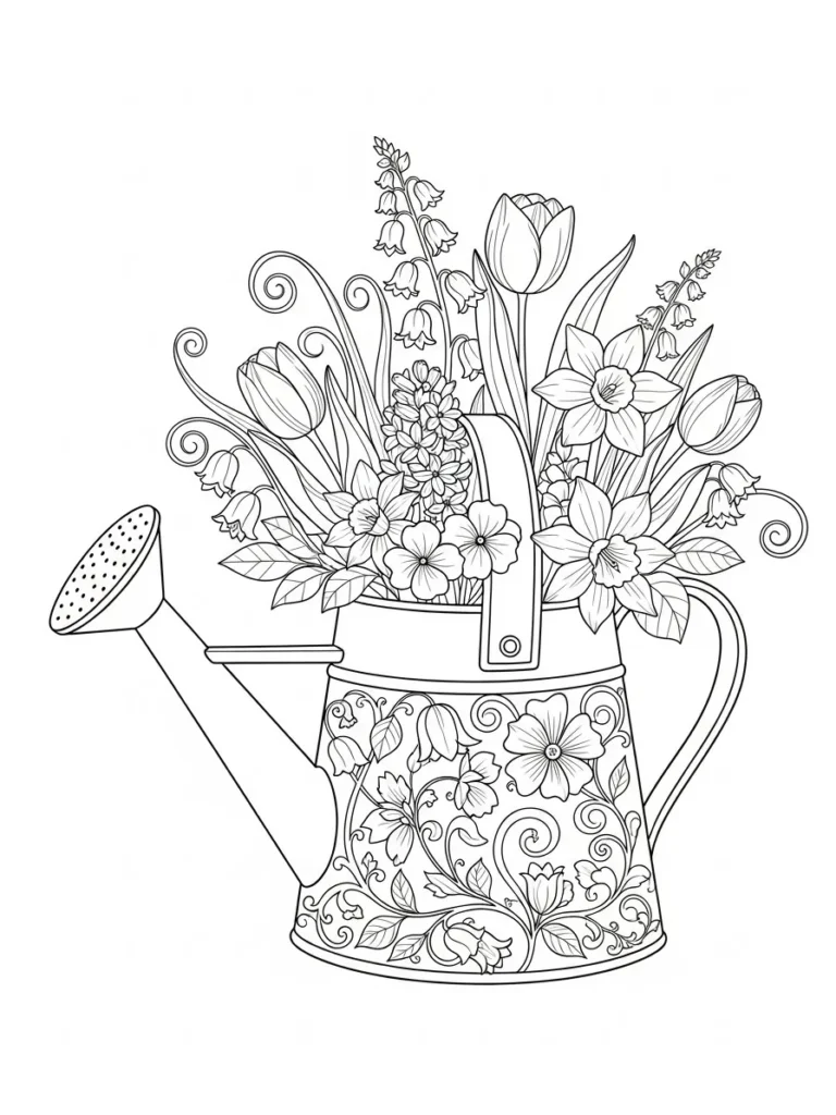 This coloring page features a charming watering can filled with a fresh mix of spring flowers, including tulips, daffodils, and small bell shaped blooms. The can itself is decorated with elegant floral patterns and gentle swirls, adding texture and interest without overpowering the flowers. Fine clean lines define each petal, leaf, and curve, creating a balanced layout that feels detailed yet open and easy to enjoy.