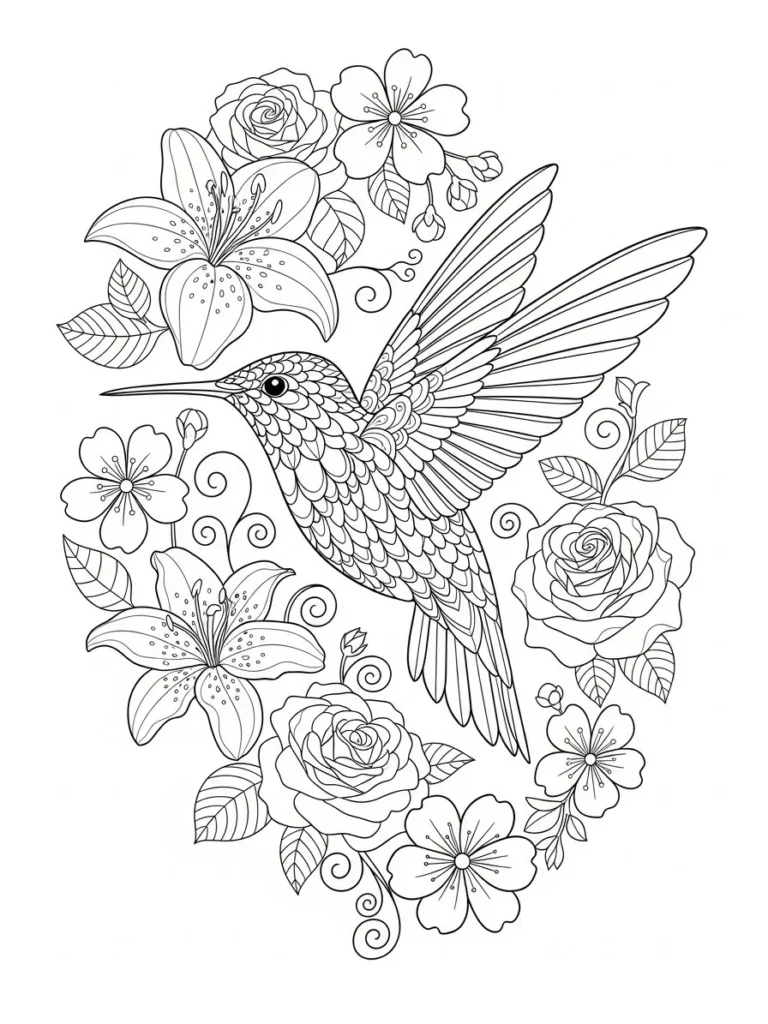 This coloring page features a delicate hummingbird in mid flight surrounded by blooming spring flowers and curling leafy vines. The bird is drawn with layered feather details that add texture and movement, while the wings stretch outward in a soft flowing shape. Roses and lily style blossoms frame the scene, balanced with gentle swirls and leaves that keep everything feeling light and elegant. The line work is fine and clean, offering plenty of detail without making the design feel crowded.