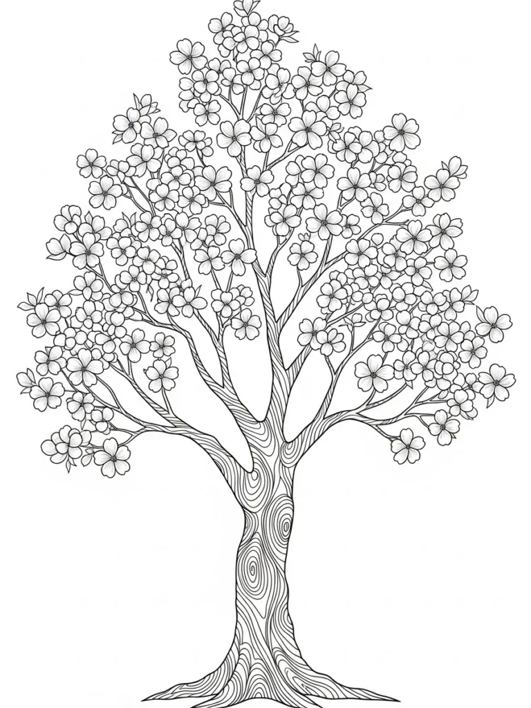This coloring page shows a graceful spring tree covered in clusters of small blossoms, spreading outward in a soft, balanced shape. The branches flow naturally from a sturdy trunk filled with subtle wood grain patterns, adding texture without overpowering the design. The flowers are outlined with fine, even lines that keep the page detailed yet approachable, while the open background gives the whole scene a calm and airy feel.