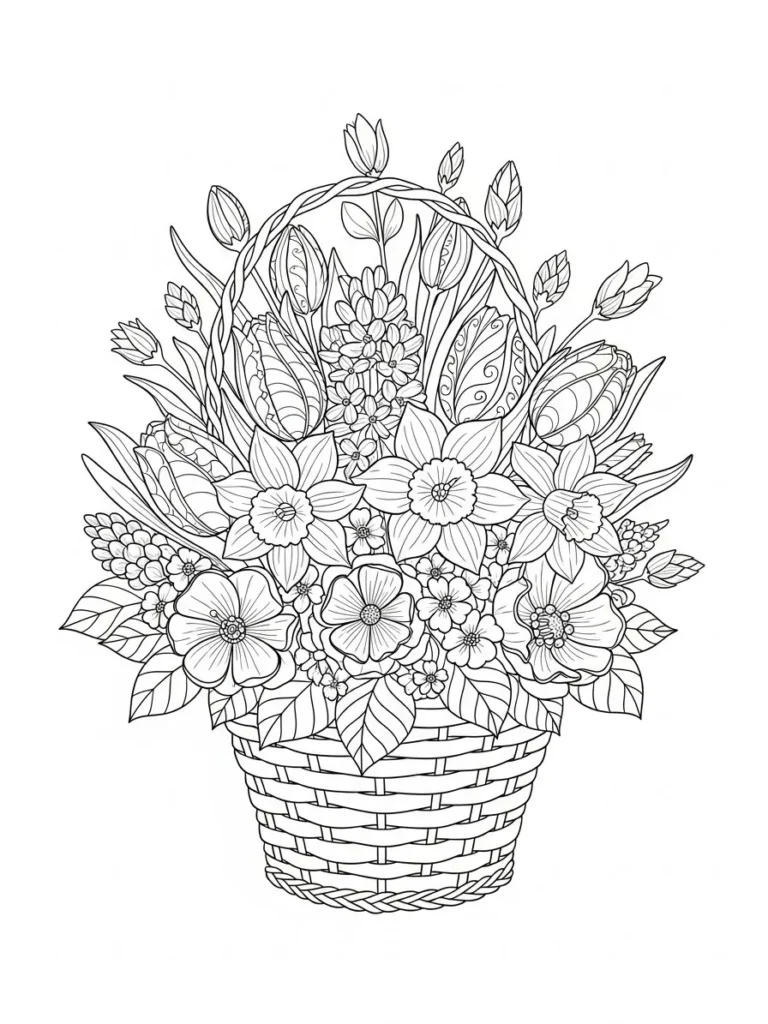 This coloring page features a charming woven basket overflowing with spring flowers, layered leaves, and budding stems that create a full and lively arrangement. The basket has neat, repeating weave patterns with medium line thickness, while the flowers are drawn with fine details that highlight petals, centers, and gentle curves. The composition feels nicely balanced, with taller blooms rising in the center and softer florals spilling outward, giving the page a warm and inviting springtime look.