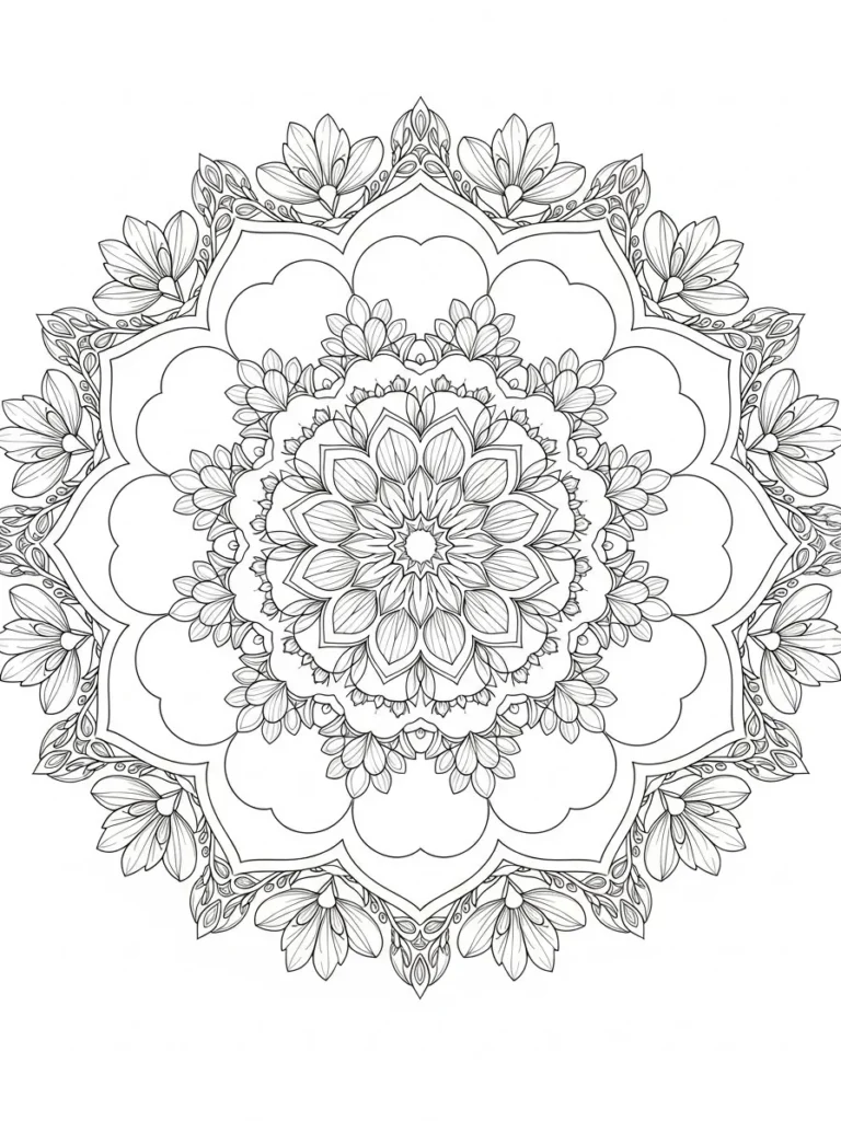This coloring page features a beautifully balanced floral mandala filled with layered petals, leafy accents, and soft symmetrical curves. The design radiates outward from a detailed center flower, with repeating petal shapes and gentle botanical patterns creating a calm and harmonious layout. The line work is fine and consistent, giving plenty of room for careful shading while still feeling open and breathable across the page.