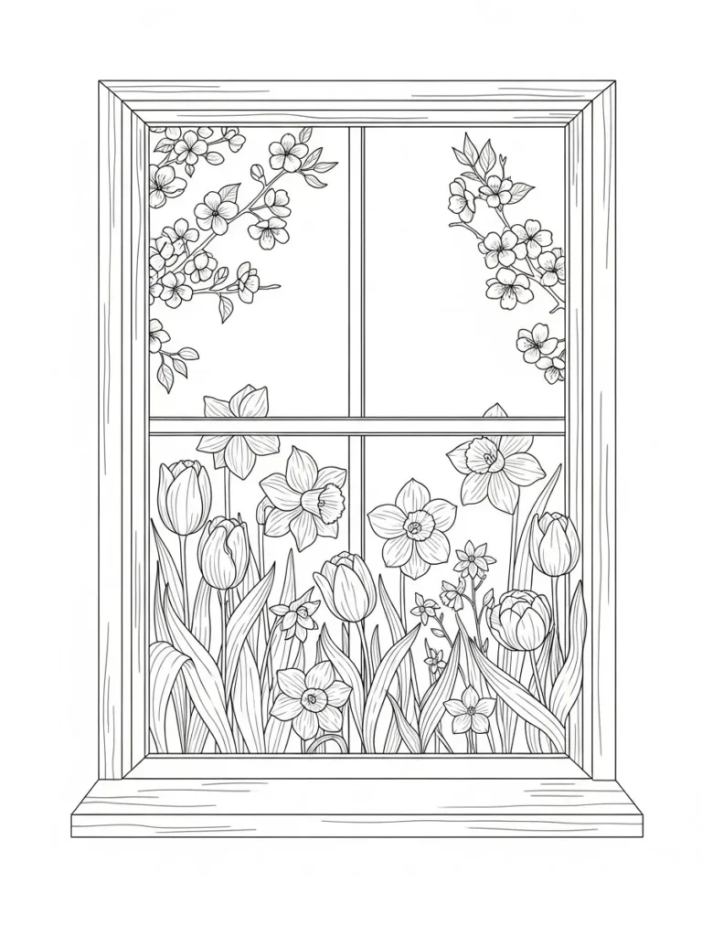 This coloring page shows a charming window frame looking out onto a blooming spring garden filled with tulips, daffodils, and delicate flowering branches. The wooden window frame has clean, simple lines that nicely balance the more detailed flowers and leaves growing just beyond the glass. The floral elements are drawn with fine outlines and gentle curves, creating a layered scene that feels calm and inviting without looking too busy.