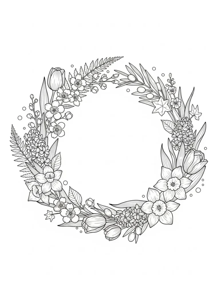 This coloring page features a light and graceful circular wreath made from a mix of spring flowers, buds, and leafy stems arranged in a flowing ring. The design balances open space with detailed floral clusters, giving the wreath a soft and natural look instead of feeling too packed. The lines are fine and clean, especially in the petals and leaves, which makes the whole layout feel elegant and easy on the eyes while keeping plenty of detail to enjoy.