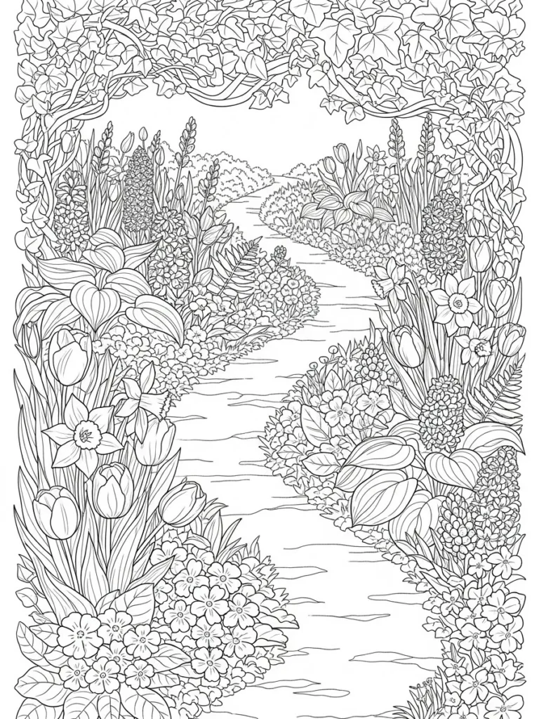 This coloring page shows a gentle garden path winding through lush spring flowers and leafy borders, framed by climbing vines overhead. Tulips, daffodils, and soft clustered blooms line both sides of the path, creating a layered and immersive scene that pulls your eye toward the distance. The line work is fine and detailed, especially in the leaves and petals, while the flowing path and open center space keep the layout balanced and easy to follow.