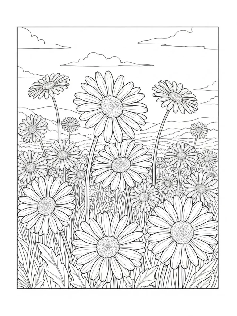 This coloring page captures a cheerful spring meadow filled with tall daisies swaying across an open landscape. The flowers vary in size and height, creating a natural sense of depth, while the rounded petals and textured centers add gentle detail without feeling too dense. Soft rolling hills and simple cloud shapes sit in the background, framed by a clean border that keeps everything feeling balanced and calm. The line work is smooth and consistent, making the scene feel open and inviting.