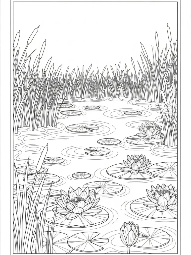 This coloring page shows a calm spring pond surrounded by tall grasses and cattails, with water lilies floating gently across the surface. The composition feels open and balanced, with smooth ripples in the water and rounded lily pads creating a soft sense of movement. The line work is clean and consistent, mixing simple flowing lines in the water with more detailed petals and reeds around the edges, which keeps the scene detailed without feeling overwhelming.
