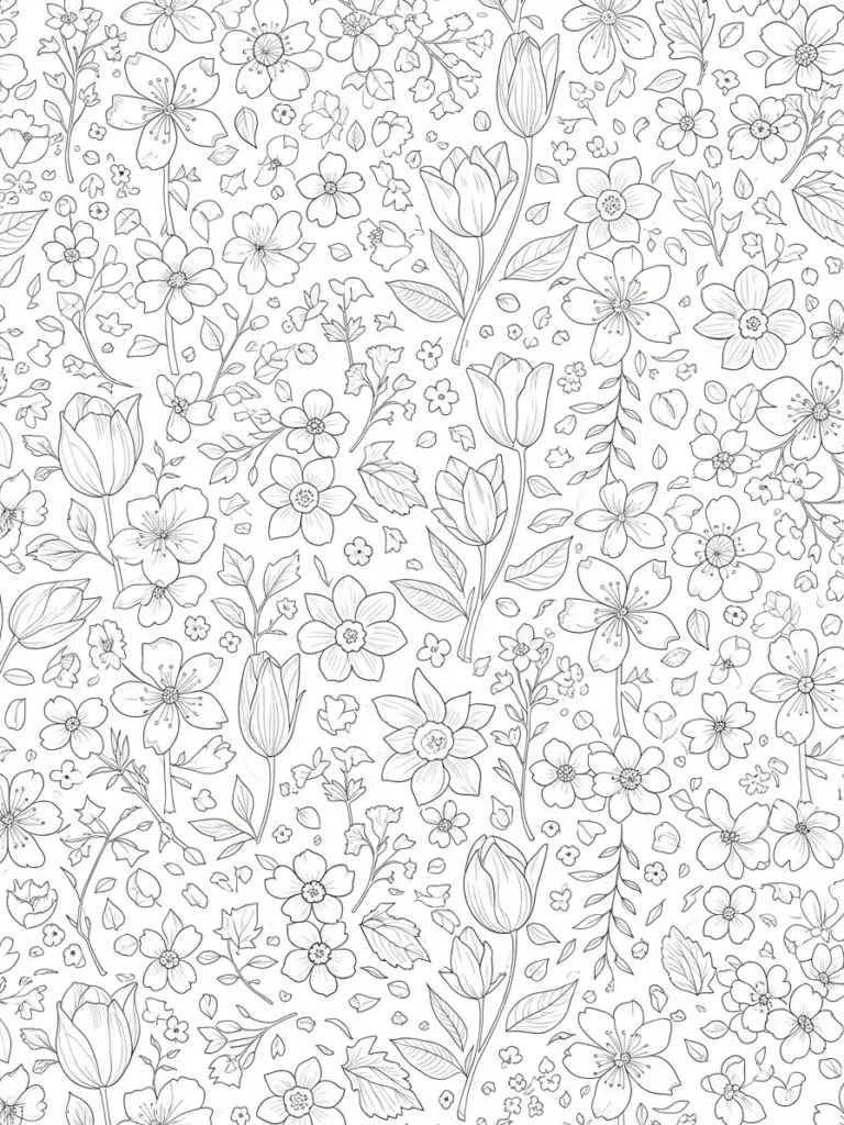 This coloring page is filled edge to edge with a lively mix of spring wildflowers, leafy sprigs, and tiny petals scattered throughout the background. The layout feels like a seamless floral pattern, with flowers facing different directions to keep the design playful and dynamic. Fine line work defines each petal and leaf, giving the page lots of detail while still feeling light and airy instead of heavy or crowded.