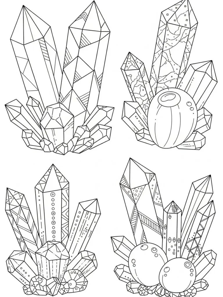 This coloring page features a collection of tall crystal clusters arranged in a calm balanced layout that feels both structured and organic. Each crystal is drawn with clean medium weight lines and filled with geometric segments subtle stripes dots and natural stone textures. Some clusters include smooth rounded orbs nestled at the base which softens the sharp edges and adds visual contrast. The overall design feels open and airy with plenty of white space while still offering lots of small sections to color at your own pace.
