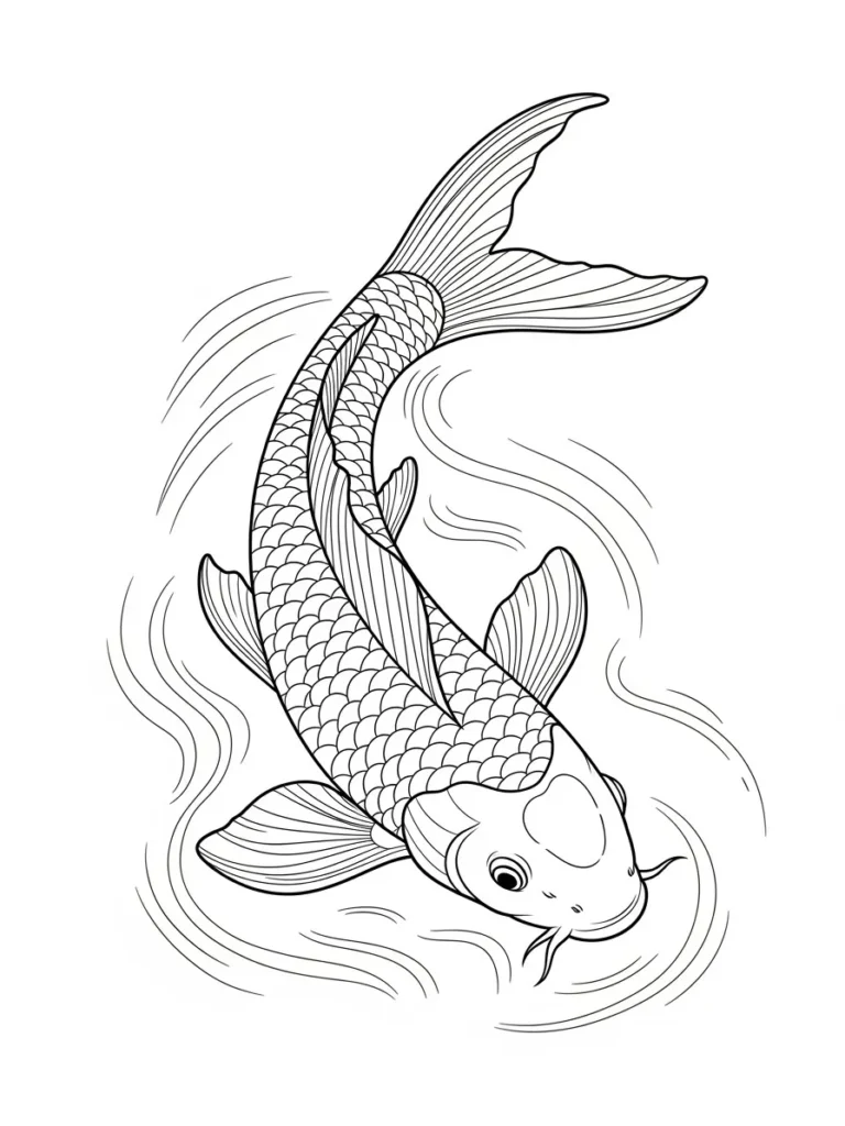 This coloring page features a single koi fish swimming in a gentle curved motion surrounded by soft flowing water lines. The fish body is detailed with neat overlapping scales while the fins and tail fan out with smooth elegant strokes. The line work is clean and balanced with enough detail to stay interesting without feeling crowded. The open background keeps the focus on the koi and the natural movement of the water which gives the whole design a calm fluid feel.