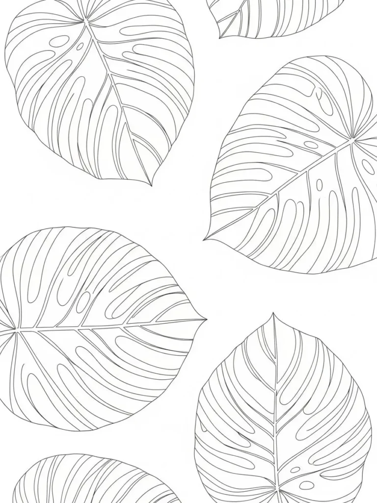 This coloring page features a collection of large tropical style leaves arranged with plenty of open space between them. Each leaf has smooth rounded edges and flowing vein lines that curve gently across the surface. The line work is thin and clean which keeps the design light and calming without feeling flat. The layout feels airy and relaxed with each leaf given room to shine on its own.