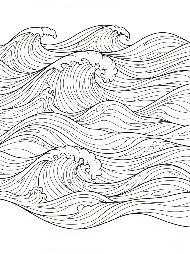 This coloring page is filled with rolling ocean waves drawn in smooth continuous curves that move naturally across the page. Each wave is built from layered flowing lines that create depth and motion without feeling busy. The foam details are soft and rounded which balances the stronger wave shapes nicely. Line thickness stays consistent and clean making the overall design feel calm and fluid from edge to edge.
