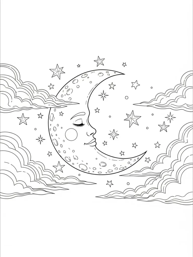 This coloring page features a peaceful crescent moon with a soft feminine face floating among fluffy clouds and scattered stars. The lines are clean and gentle with just enough detail in the moon texture and star shapes to keep things interesting without feeling busy. The clouds frame the scene beautifully and add a cozy layered look while the open background keeps everything light and calm.