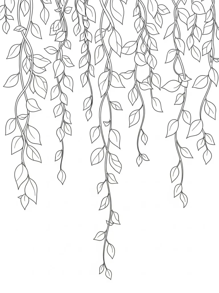 This coloring page features long flowing vines that cascade downward with softly shaped leaves spaced along each stem. The lines are thin and graceful which gives the design a light airy feel. Each vine curves naturally creating a calm sense of movement while the leaves add simple detail without crowding the page. The open background keeps everything uncluttered and soothing which makes the layout feel balanced and peaceful.