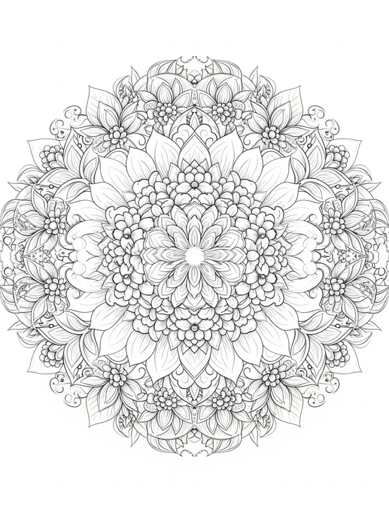 This coloring page features a richly detailed floral mandala filled with layered petals blossoms and leafy accents arranged in perfect symmetry. The design builds outward from a small central flower into repeating rings of flowers and curved decorative elements. Line thickness stays fine and consistent which keeps all the detail crisp without feeling heavy. The overall layout feels full and luxurious while still maintaining a beautiful sense of balance.