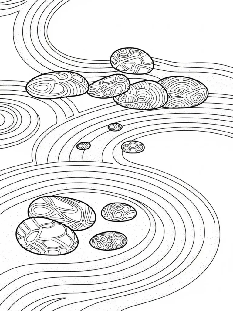 This coloring page features smooth rounded stones resting in gently curved sand patterns inspired by a peaceful zen garden. Each stone has soft abstract line details that add interest while keeping the shapes calm and organic. The sand flows around the stones in wide looping lines that guide the eye across the page in a slow relaxing rhythm. Line thickness is clean and consistent which makes the whole layout feel balanced and soothing.