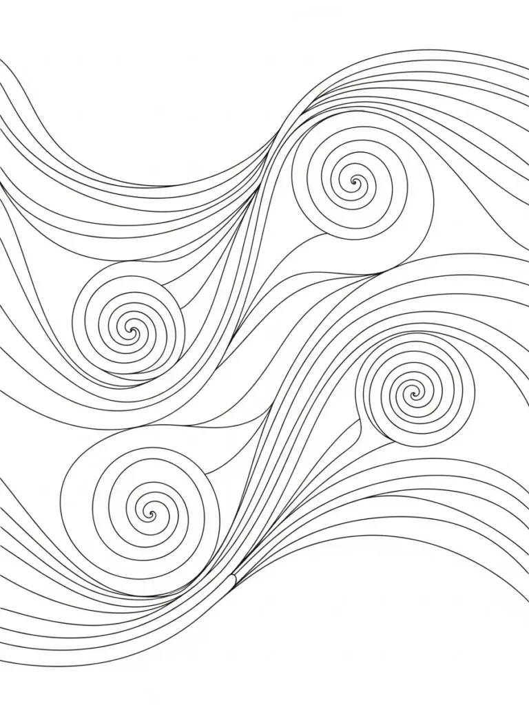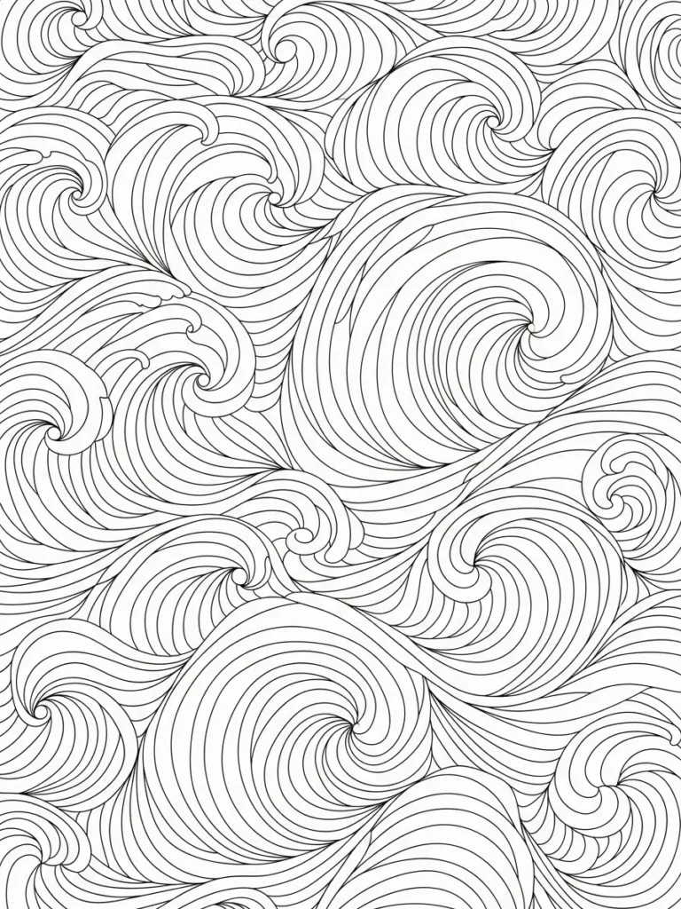 This coloring page is filled edge to edge with flowing wave shapes that curl and twist into soft spirals. The lines are thin and consistent creating a smooth rhythmic pattern that feels almost like movement frozen on paper. Each wave overlaps naturally with the next which gives the design depth without making it feel heavy. The layout is continuous and immersive with no harsh breaks which makes the whole page feel fluid and calming.